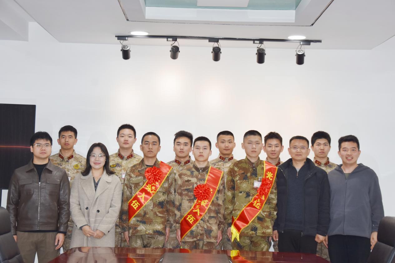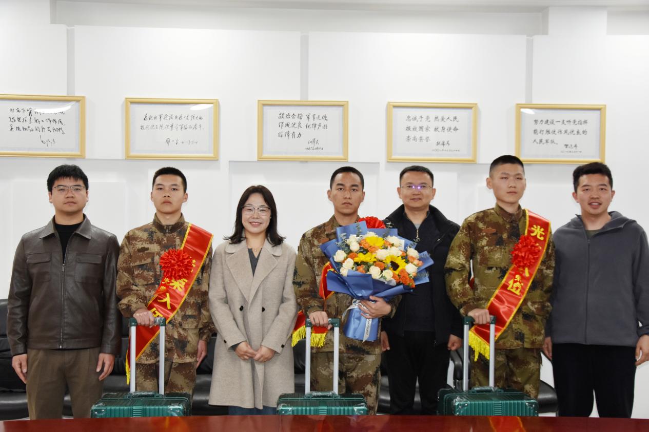 座谈会上,与会老师为新兵佩戴绶带、红花,赠送行李箱等慰问品并合影留念。