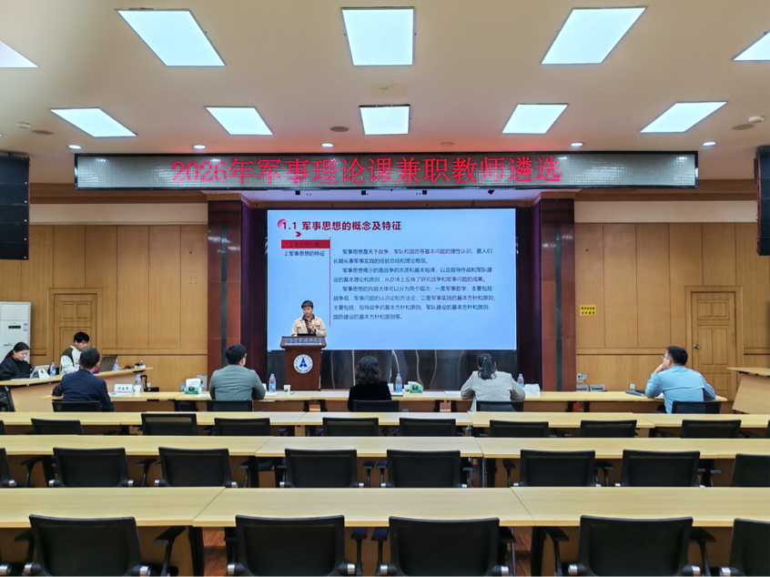 (通讯员:石林炎 摄影:罗蓉蓉 黄孝伟)为进一步落实立德树人根本任务,配齐配强军事理论授课教师,4月2日上午,2026年军事理论课兼职教师遴选试讲在文潭楼四楼报告厅举行。党委学生工作部、人民武装部部长黄小妹、副部长白雷,人事部副部长潘嫄,本科生院教师发展中心主任王广波,军事教研室主任胡万松担任评委。